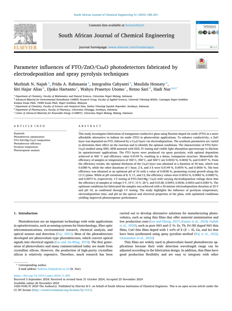 Tadi siang, saya mendapat kunjungan yang menyenangkan dari beberapa mahasiswa bimbingan saya yang telah menyelesaikan skripsi mereka tahun lalu. Mereka adalah Muthiah Nailin Najah, Frida Annisa Rahmania, Integralita Cahyanti, dan Maulida Hesnaty. Senang sekali bisa bertemu dan bernostalgia dengan mereka. Saya turut senang mendengar bahwa penelitian mereka yang berjudul “Parameter influences of FTO/ZnO/Cu₂O photodetectors fabricated by electrodeposition and spray pyrolysis techniques” telah dipublikasikan di South African Journal of Chemical Engineering (Volume 51, 2025, halaman 188-201). Publikasi ini tentu merupakan hasil dari kerja keras, ketekunan, dan dedikasi tinggi mereka selama proses penelitian. Mereka juga telah menuliskan dan membagikan pengalaman mereka selama melakukan penelitian di blog ini. Semoga refleksi mereka tersebut dapat menginspirasi mahasiswa lainnya untuk terus semangat melakukan riset dan berkontribusi pada dunia ilmu pengetahuan.